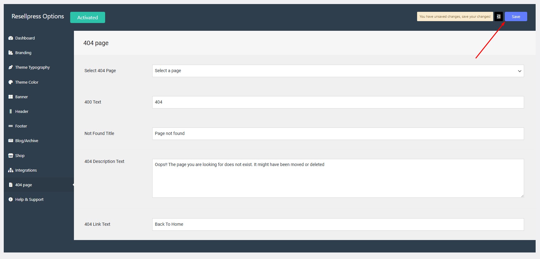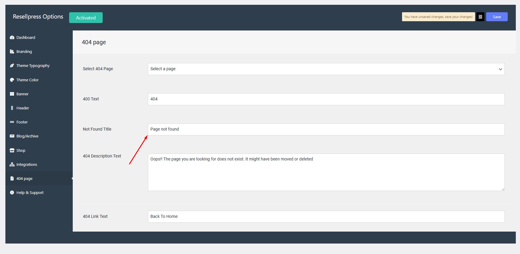 Navigate to Options > 404 page > Not Found Title.