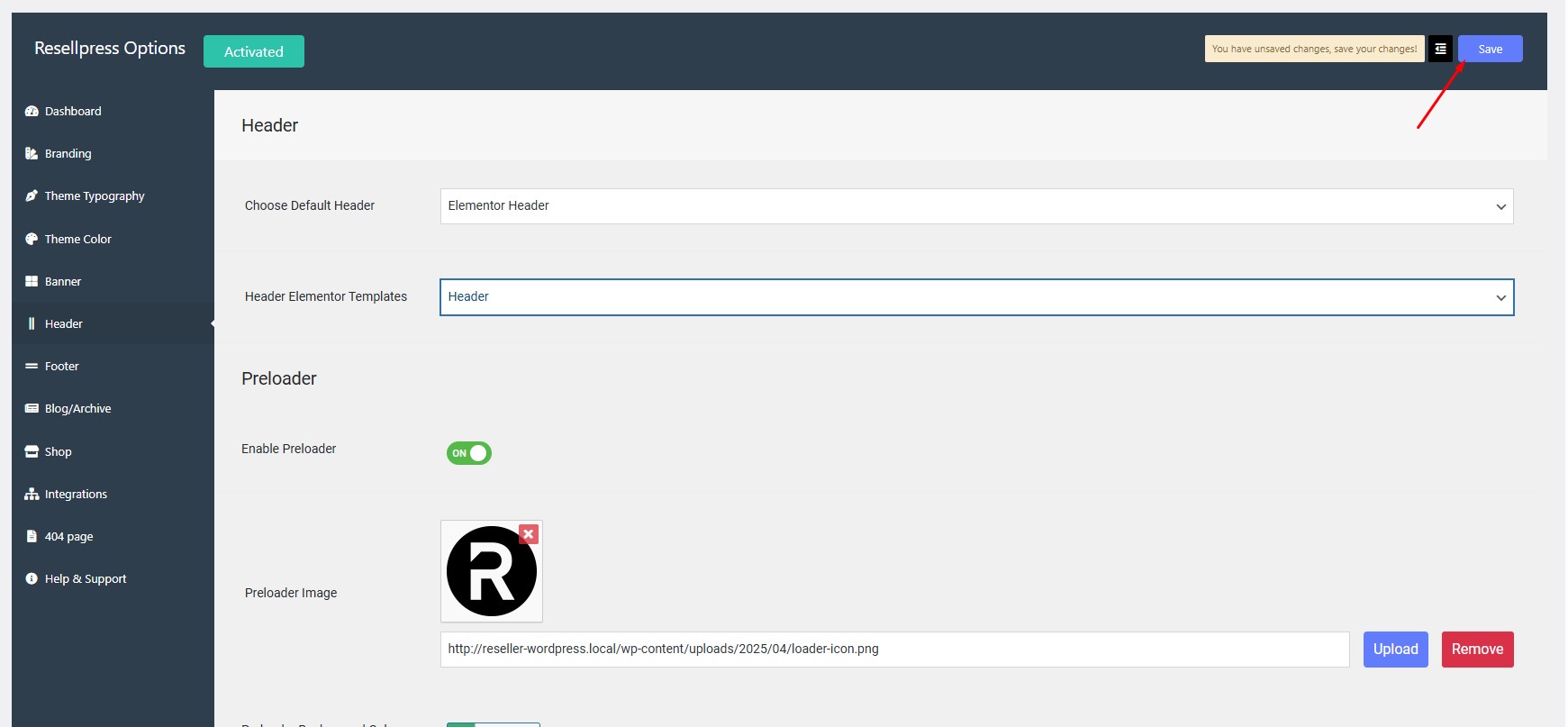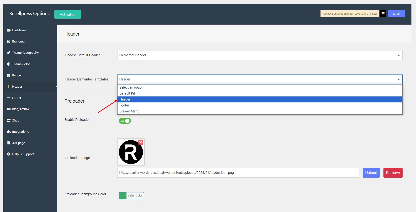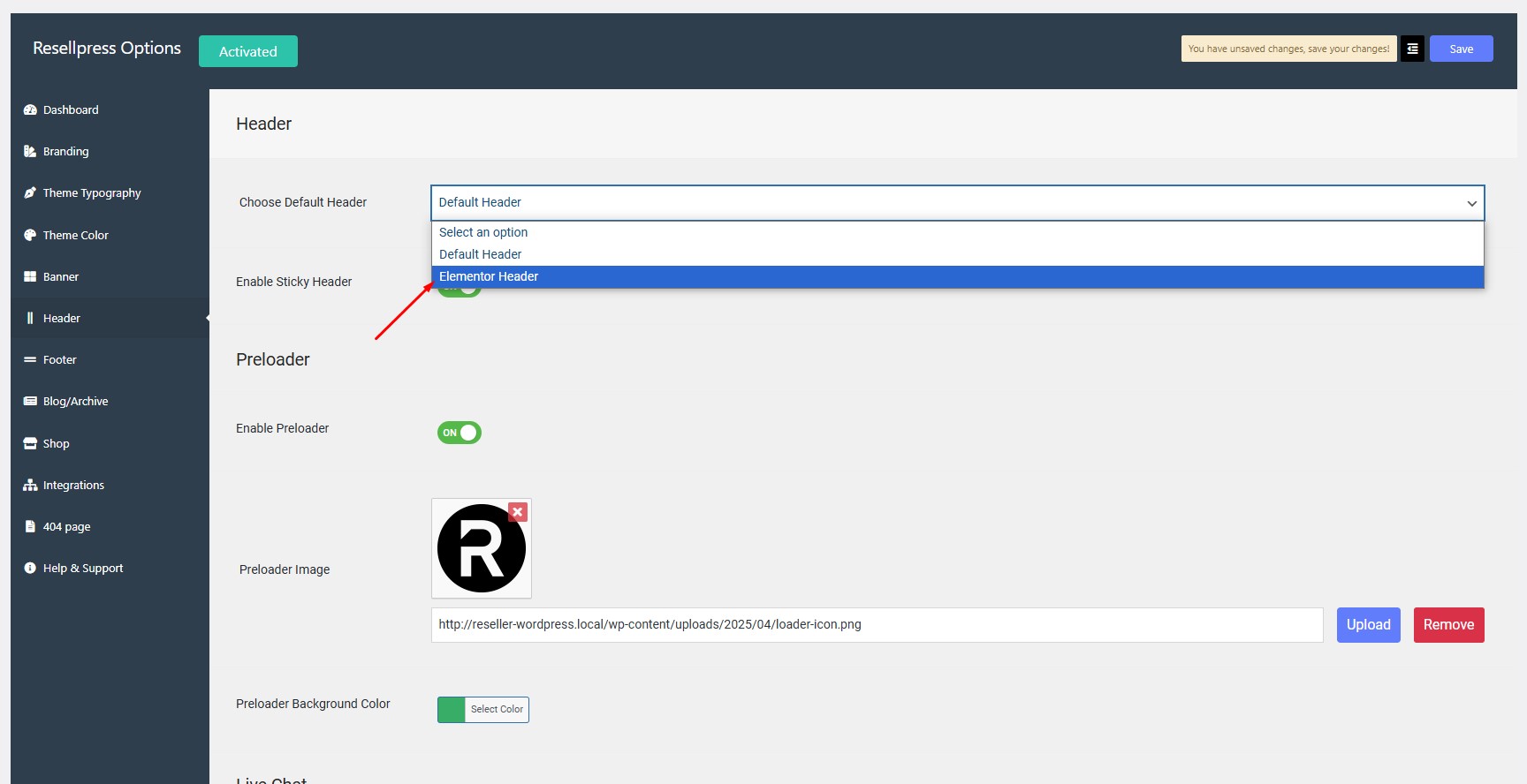 Select the template from the drop down of Header Elementor Templates.