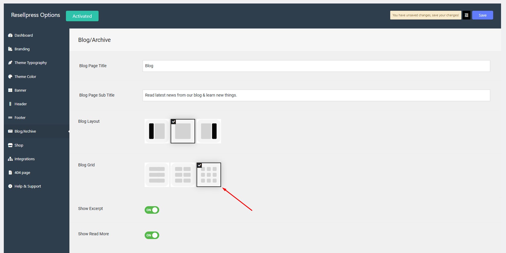 If you want to display three posts per row on blog archive page click on right thumbnail next to blog grid showing three vertical lines.